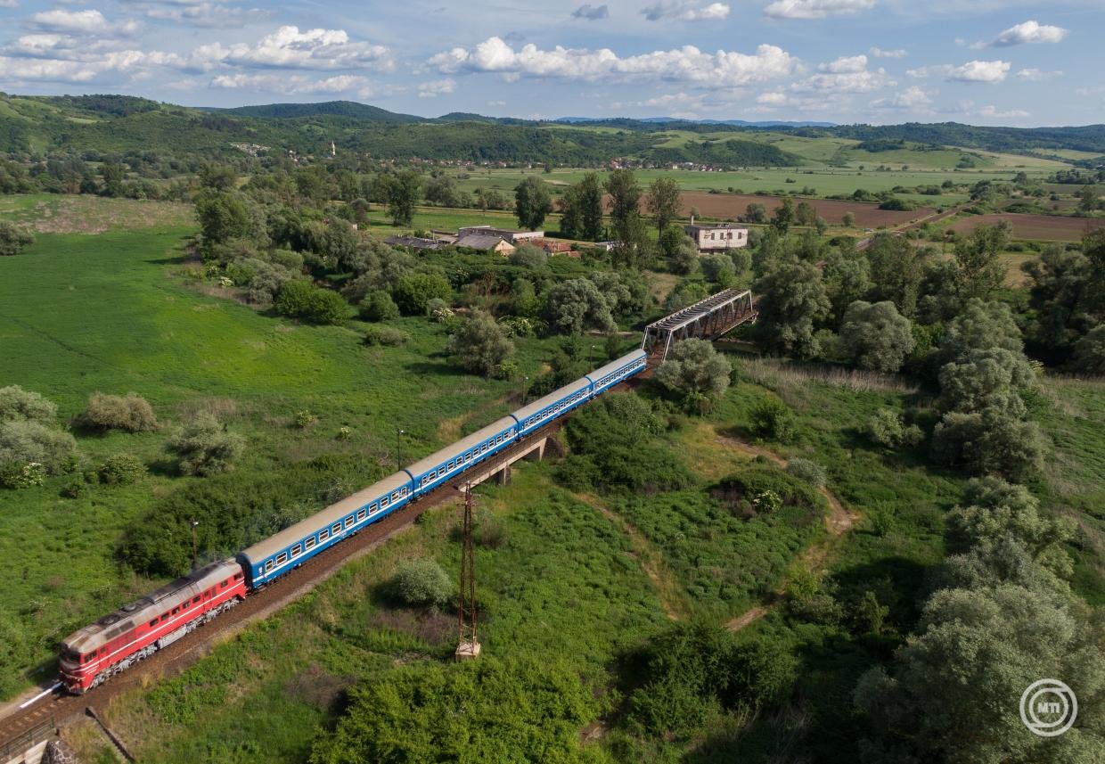 Fotó: Bánréve, 2025. május 31. A drónnal készült felvételen M62-es dízelmozdony által vontatott korhű szerelvény közlekedik Bánrévénél a MÁV retró hétvégéjén 2025. május 31-én. MTI/Máthé Zoltán