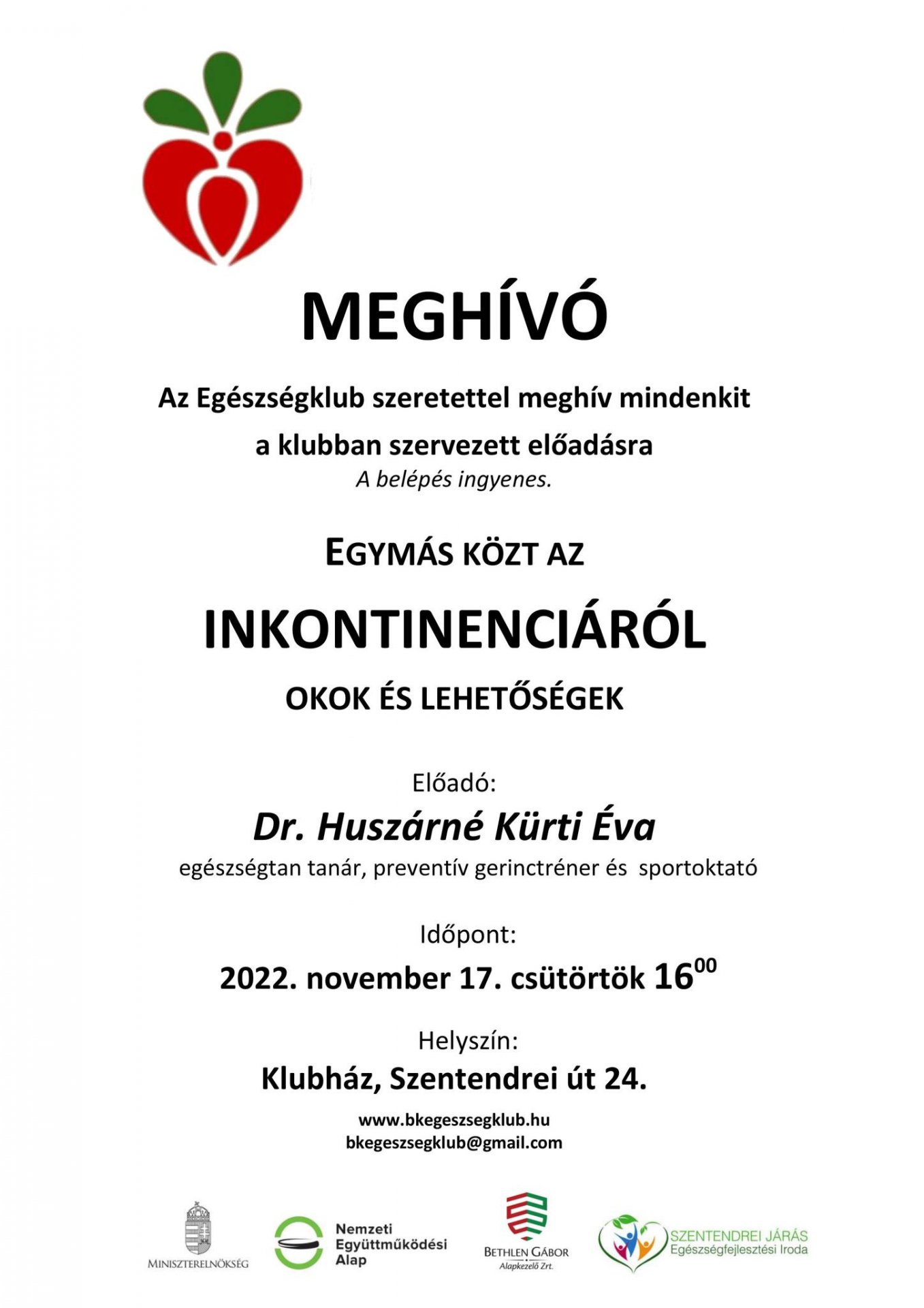 A budakalászi Egészségklub szervezésében dr. Huszárné Kürti Éva tart előadást az inkontinencia okairól és a gyógyulás lehetőségeiről ma 16 órától a Szentendrei út 24. szám alatti Klubházban. Az inkontinencia, azaz akaratlan vizeletvesztés rengeteg embernek keseríti meg a mindennapjait. Annak ellenére, hogy létezik megfelelő gyógymód a probléma kezelésére, csak minden tizedik páciens fordul orvoshoz. Többi között, erről lesz szó a mai rendezvényen, amelyre szeretettel várnak mindenkit. A belépés ingyenes.