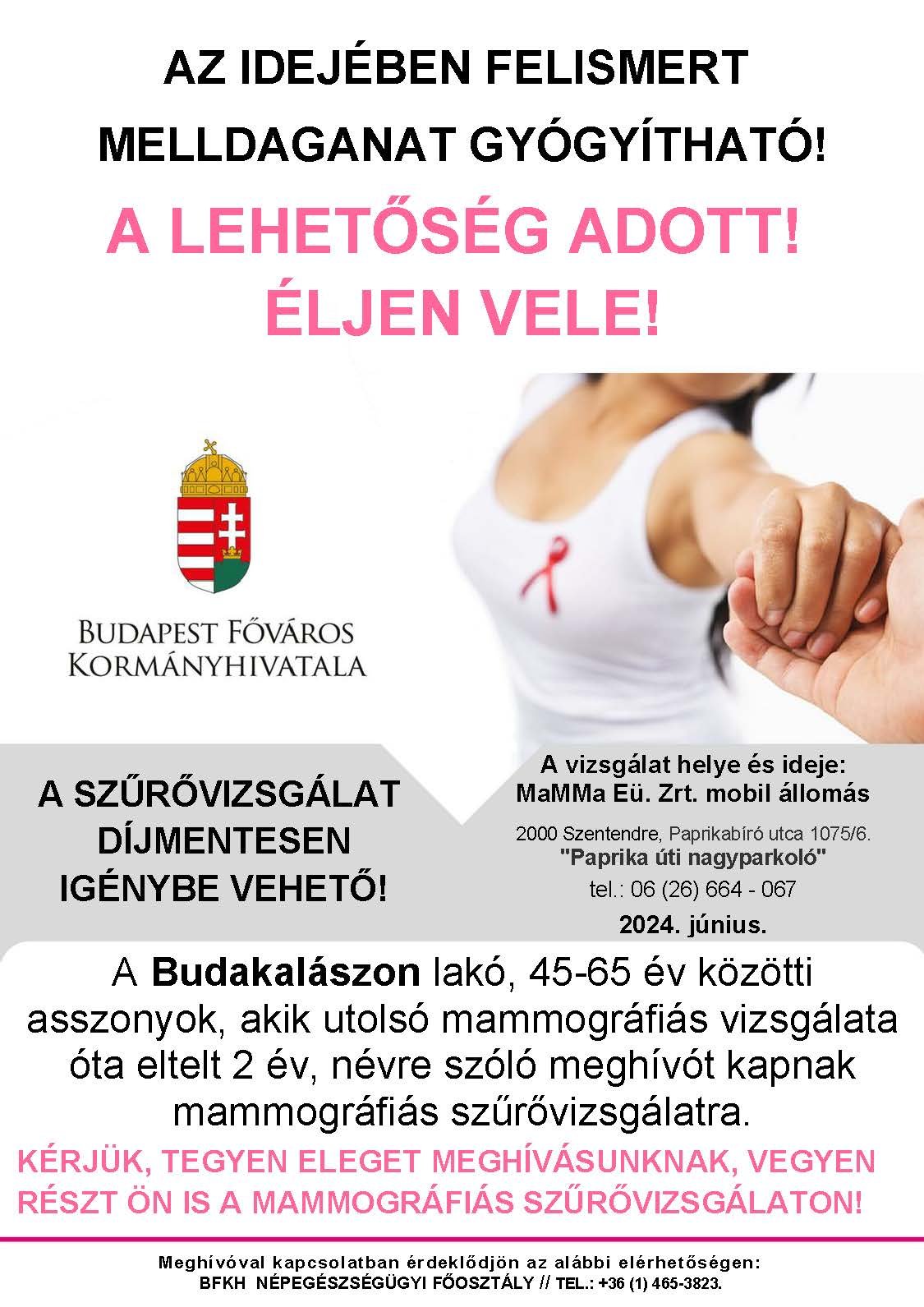 A budakalászi hölgyek szervezett mammográfiás szűrése 2024. júniusában lesz esedékes. Azok a Budakalászon állandó bejelentett lakcímmel rendelkező 45-65 év közötti hölgyek, akik több mint két évvel ezelőtt voltak utoljára mammográfiás vizsgálaton, névre szóló tájékoztatást kapnak majd a vizsgálat időpontjáról és helyszínéről.