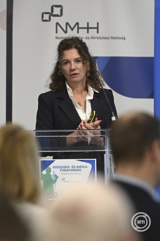 Fotó: Budapest, 2024. november 13. Ficzere Andrea, a Fogjunk Össze az Egészségügyért Alapítvány elnöke, az Uzsoki utcai Kórház főigazgatója előadást tart az Egészséges médiatudatosság - Ép ésszel az online térben című konferencián a Nemzeti Média- és Hírközlési Hatóság (NMHH) Esztergom úti épületében 2024. november 13-án. MTI/Lakatos Péter