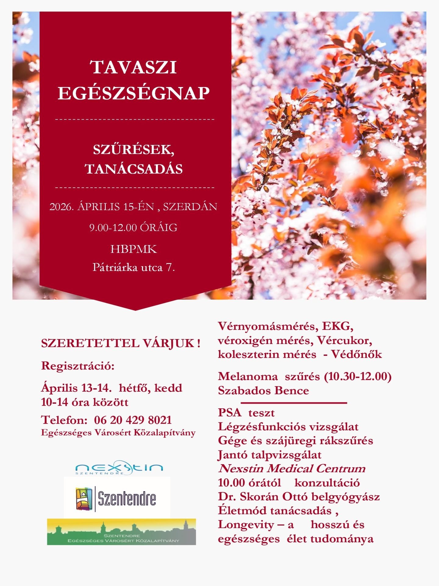 Szentendre Város Egészségtervével összhangban idén is megrendezik a Tavaszi Egészségnapot, amelynek célja a lakosság egészségtudatosságának növelése és a betegségek megelőzése. 2026. április 15-én, szerdán 9:00 és 12:00 óra között a Hamvas Béla Pest Megyei Könyvtár (Pátriárka utca 7.) ad otthont a rendezvénynek, ahol számos szakvizsgálat és tanácsadás érhető el egy helyen.