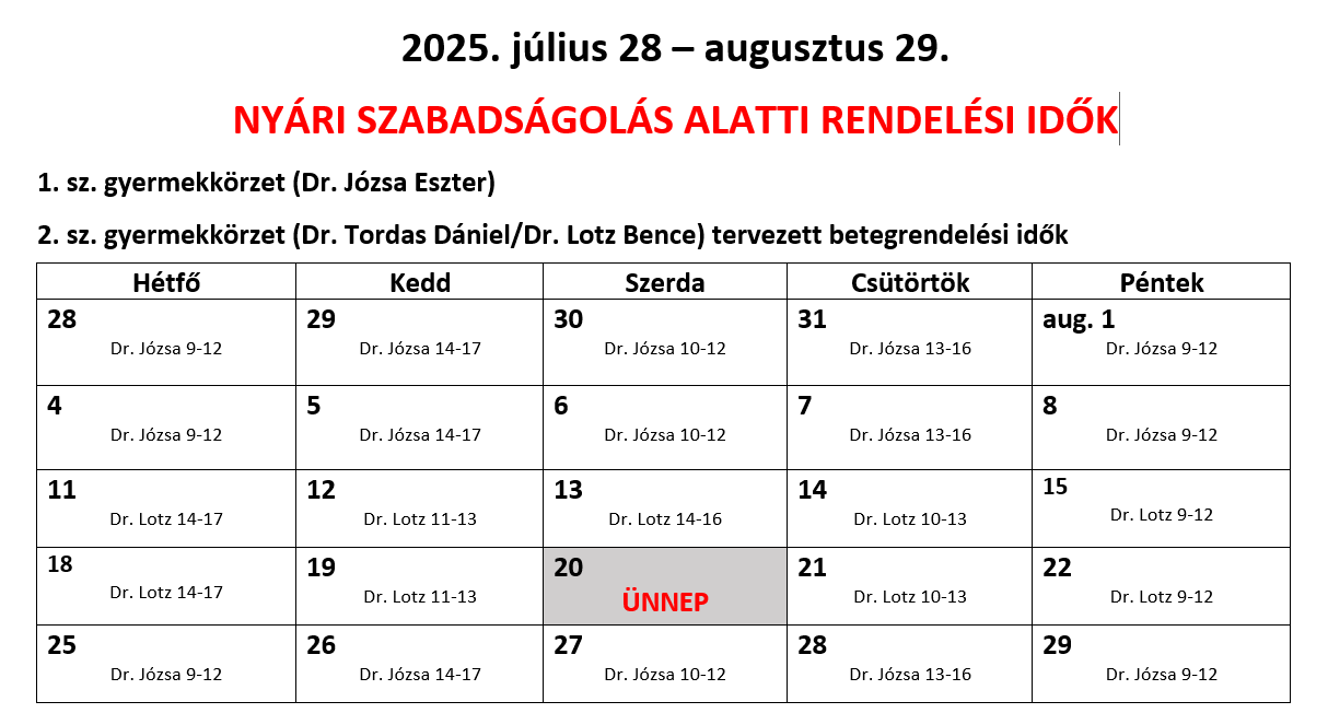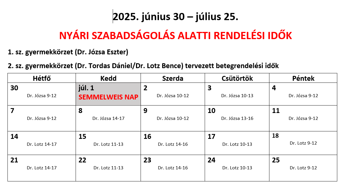 Június 23. és 27. között dr. Józsa Eszter szabadsága miatt a gyermekek és szüleik dr. Lotz Bencéhez fordulhatnak a rendelési időben.