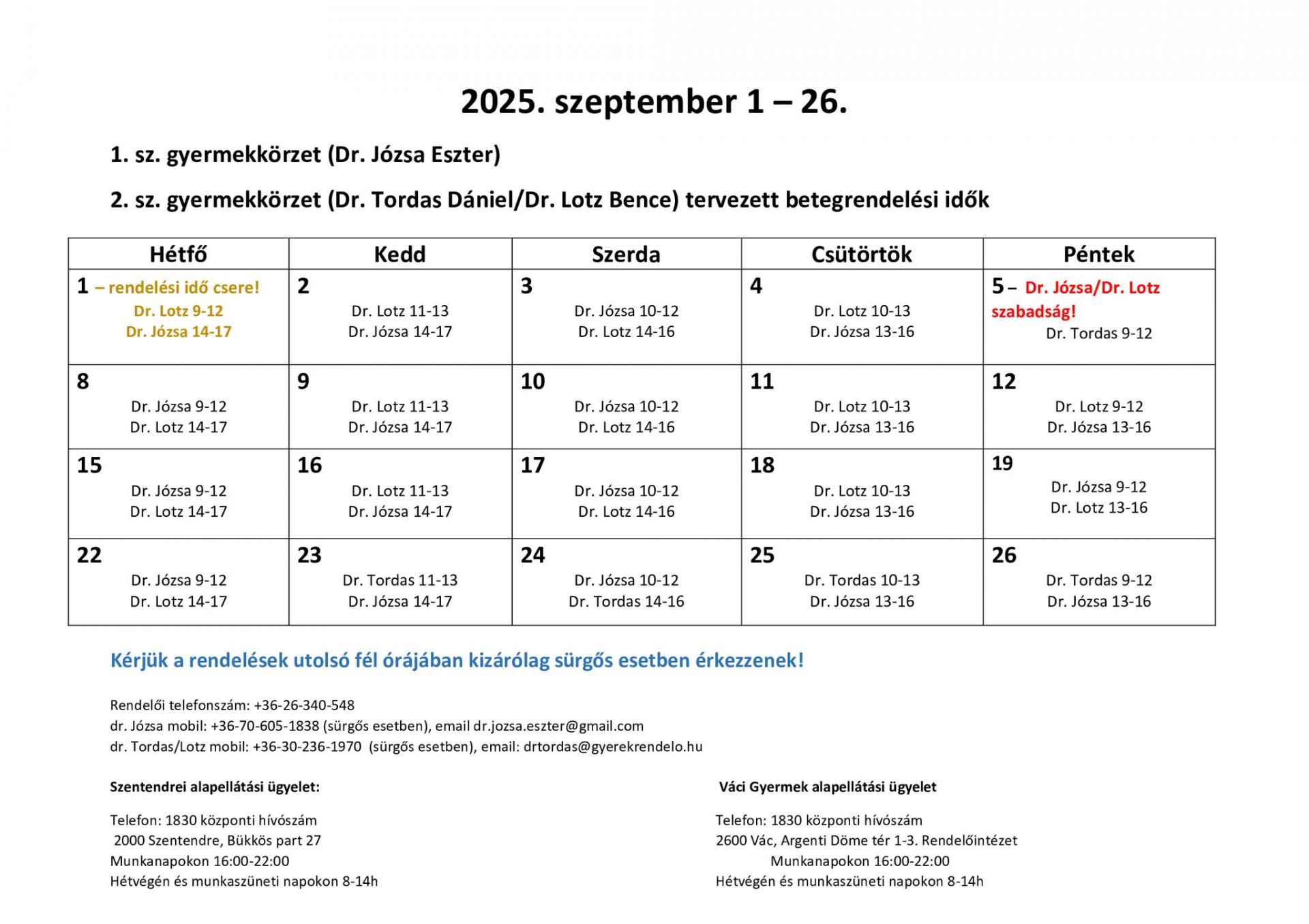 Szeptember 1-jén, hétfőn délelőtt 9:00–12:00 között Lotz doktor, délután 14:00–17:00 között pedig Józsa doktornő látja el a betegeket.