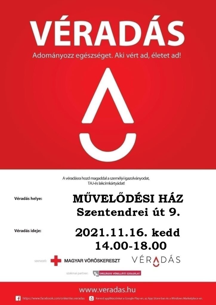 November 16-án, kedden 14.00 és 18.00 óra között a Magyar Vöröskereszt véradást szervez a Faluházban. Évente 250 ezer ember dönt úgy, hogy véradásával segíti a rászoruló betegeket és önzetlenül adják a vérüket egy számukra ismeretlen embertársuknak. Köszönjük azok nevében is, akik az életmentő vérkészítmények nélkül nem gyógyulhattak volna meg!
