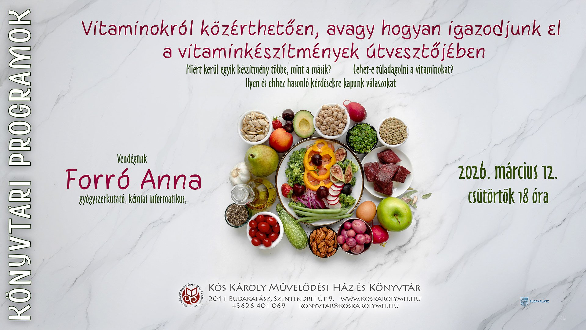 Március 12-én, csütörtökön 18 órától Forró Anna gyógyszerkutató, kémiai informatikus lesz a vendége a Kós Károly Művelődési Ház Könyvtárában. Az est címe: Vitaminokról közérthetően, avagy hogyan igazodjunk el a vitaminkészítmények világában? - olvasható a Kós Károly Művelődési Ház és Könyvtár facebook eseményében.