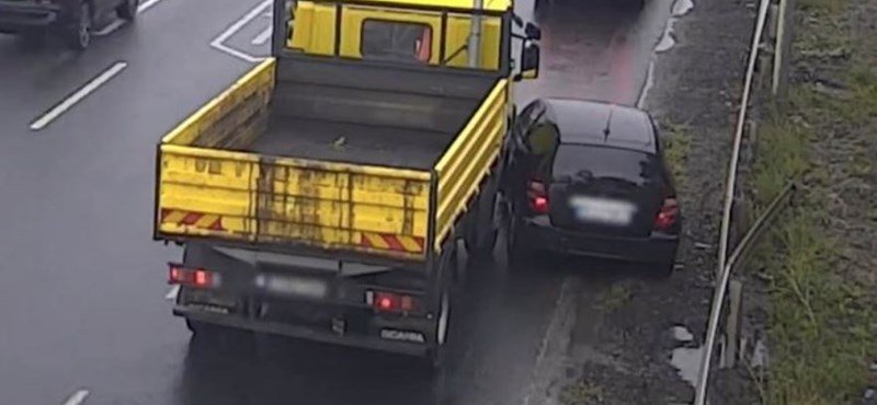 Egy teherautóba eddig ismeretlen okból “beleakadt” egy személyautó. Hosszú métereken át vonszolta, tolta maga előtt a kocsit a teherautó, amit valószínűleg a holttér miatt nem vett észre annak sofőrje.