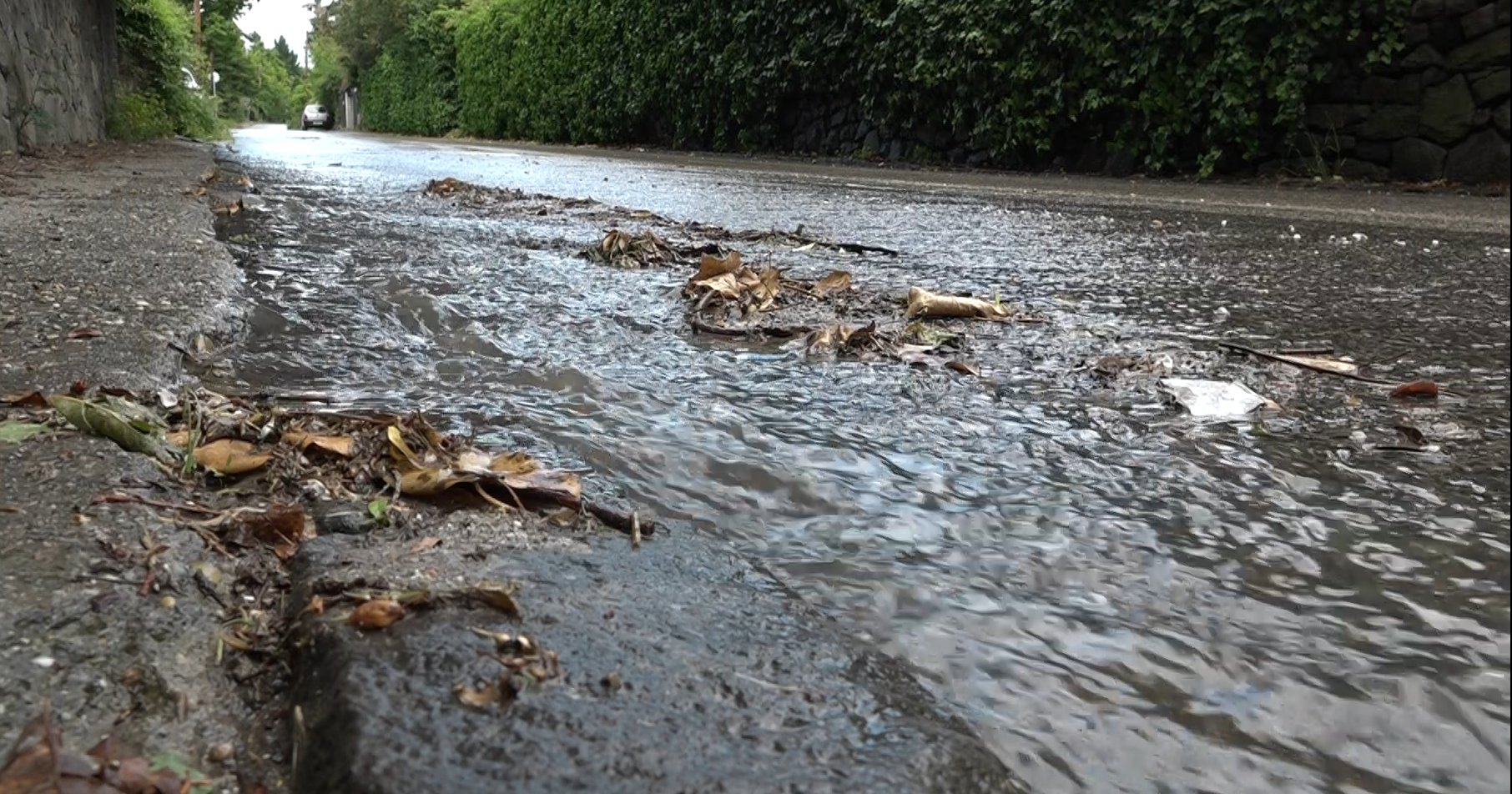 Hatalmas mennyiségű víz ömlik az útra, gyakorlatilag patakká változtatva azt.