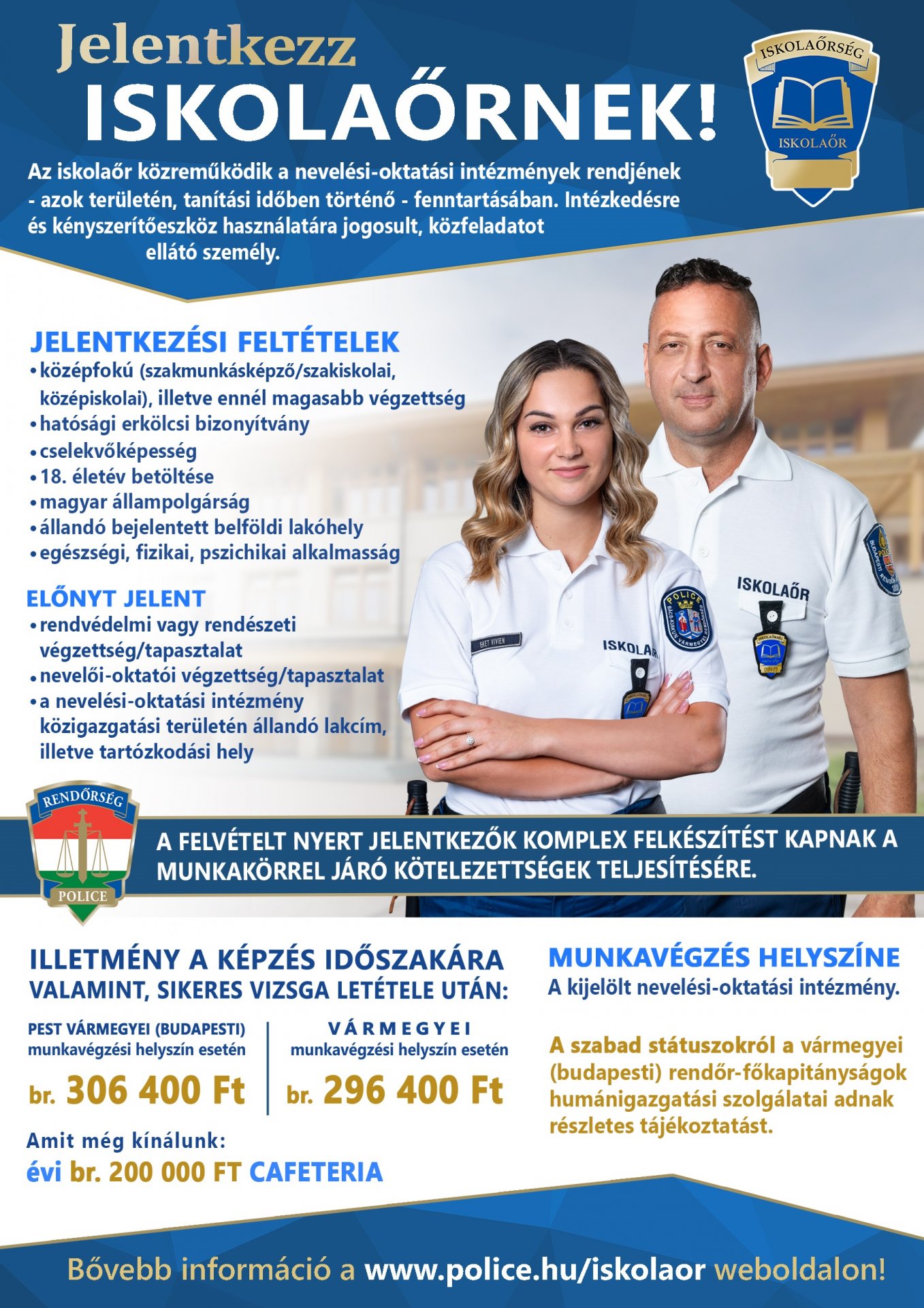 Előnyt jelent a nevelési-oktatási intézményben szerzett tapasztalat, a rendészeti végzettség és az oktatási intézmény közigazgatási területén bejelentett állandó lakcím illetve tartózkodási hely. A szabad státuszokról a vármegyei és budapesti rendőr-főkapitányságok humánigazgatási szolgálatai adnak bővebb információt. Részletek: www.police.hu/iskolaor