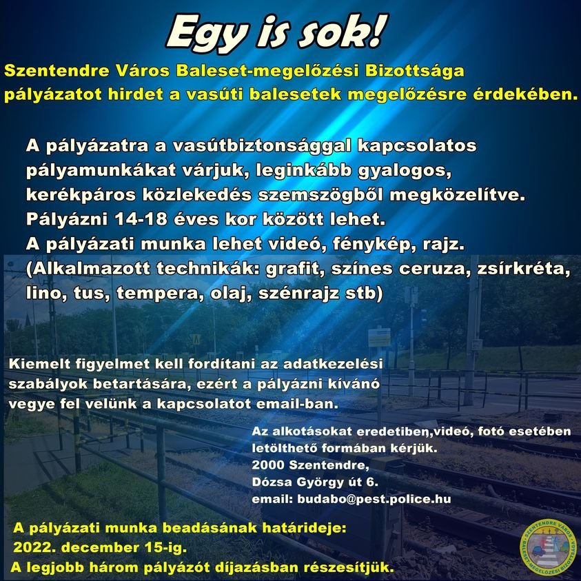 Szentendre Város Baleset-Megelőzési Bizottsága pályázatot hirdet a vasúti balesetek megelőzése érdekében – olvasható a szervezet közösségi oldalán.