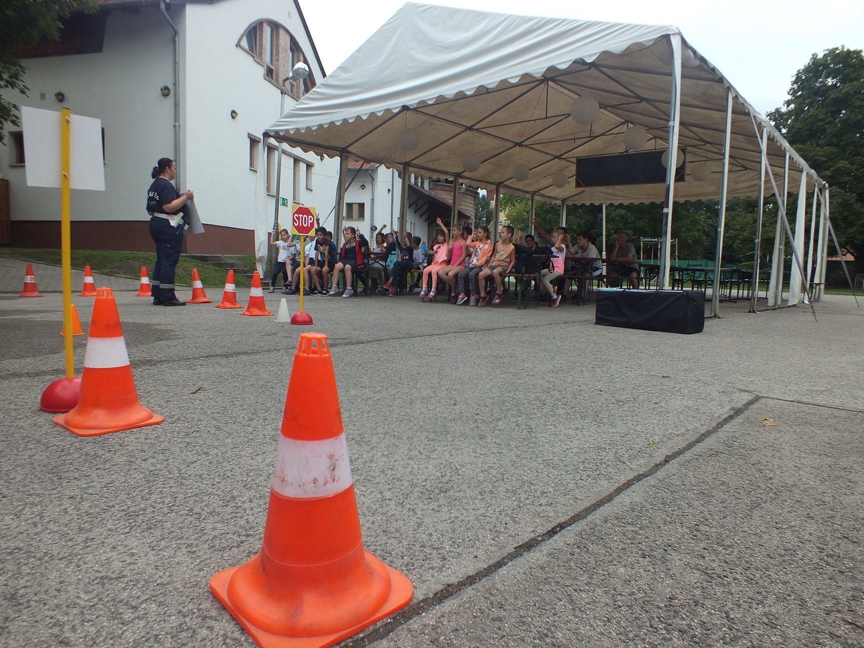 A táborozó gyerekeknek Tankó Annamária r. törzszászlós balesetvizsgáló rövid elméleti oktatást tartott a biztonságos közlekedésről, majd a gyerekek gyakorlatban tesztelhették tudásukat a felállított mini KRESZ pályán.