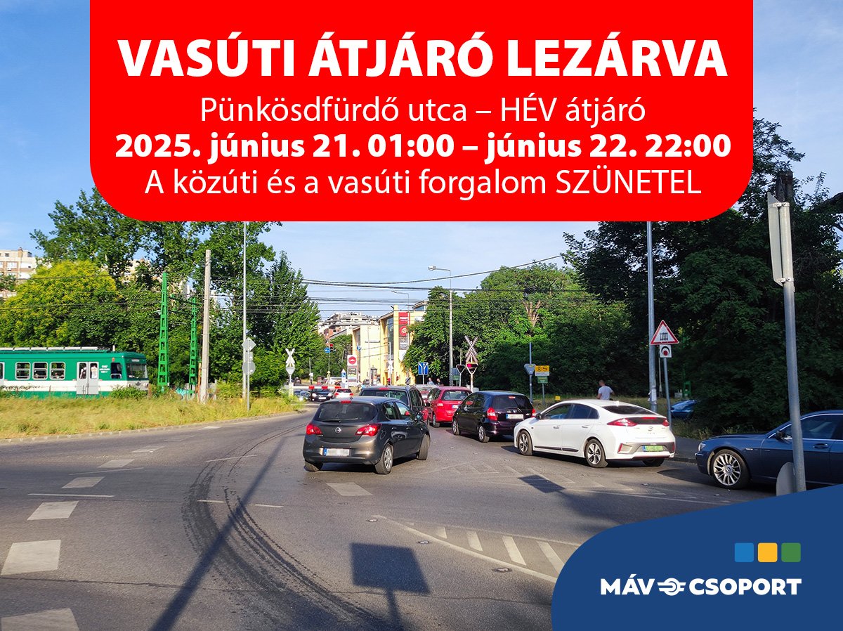 Június 21-én 01:00 órától június 22-én 22:00 óráig a Pünkösdfürdő utcai HÉV-átjárót teljes szélességében lezárják karbantartási munkák miatt. A lezárás alatt a vasúti és a keresztirányú közúti forgalom is szünetelni fog.
