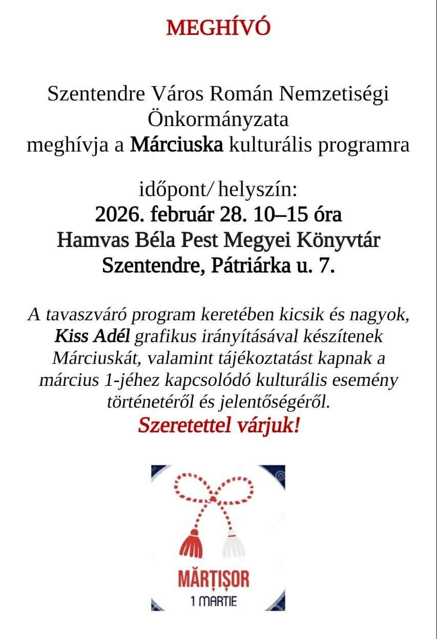 Szentendre Város Román Nemzetiségi Önkormányzata Márciuska című kulturális programra várja az érdeklődőket 2026. február 28-án 10 és 15 óra között a Hamvas Béla Pest Megyei Könyvtárban, Szentendrén, a Pátriárka utca 7. szám alatt. A tavaszváró rendezvényen kicsik és nagyok egyaránt bekapcsolódhatnak a Márciuska-készítés folyamatába Kiss Adél grafikus irányításával. - olvasható a Danubia Televízió facebook oldalán.