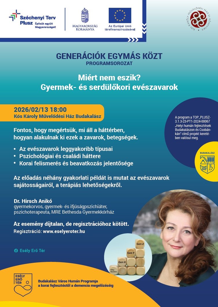 A Kós Károly Művelődési Házban 2026. február 13-án, 18:00 órakor Dr. Hirsch Anikó gyermekorvos, gyermek- és ifjúságpszichiáter, pszichoterapeuta tart előadást a gyermek- és serdülőkori evészavarokról. Az eseményen a résztvevők megismerhetik az evészavarok leggyakoribb típusait, a kialakulásuk mögött álló pszichológiai és családi okokat, valamint a korai felismerés és beavatkozás fontosságát.
