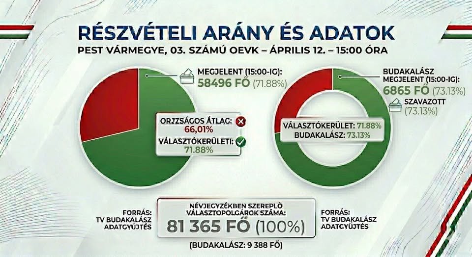 Továbbra is töretlen a választási kedv: a 15 órás adatok szerint országosan már a választópolgárok 66,01 százaléka az urnákhoz járult. 2022-ben délután 3-kor 52,75% volt a részvételi arány, és a teljes részvétel 70,21 %-os volt.