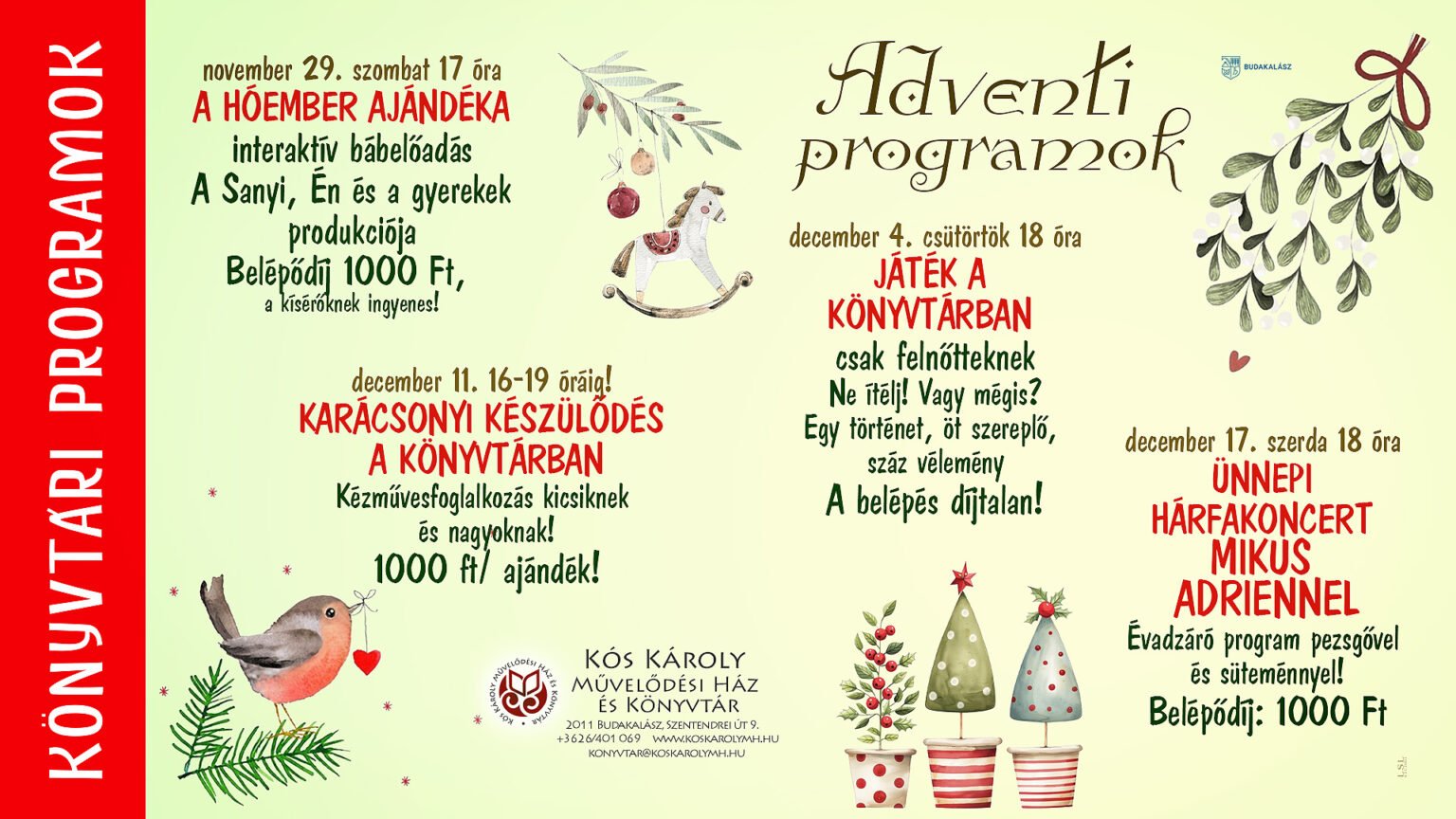 A program ingyenesen látogatható, így a könyvtár reményei szerint minél több budakalászi lakos számára nyílik lehetőség arra, hogy a karácsony előtti hetekben is tartalmas, közösségi élménnyel gazdagodjon.
