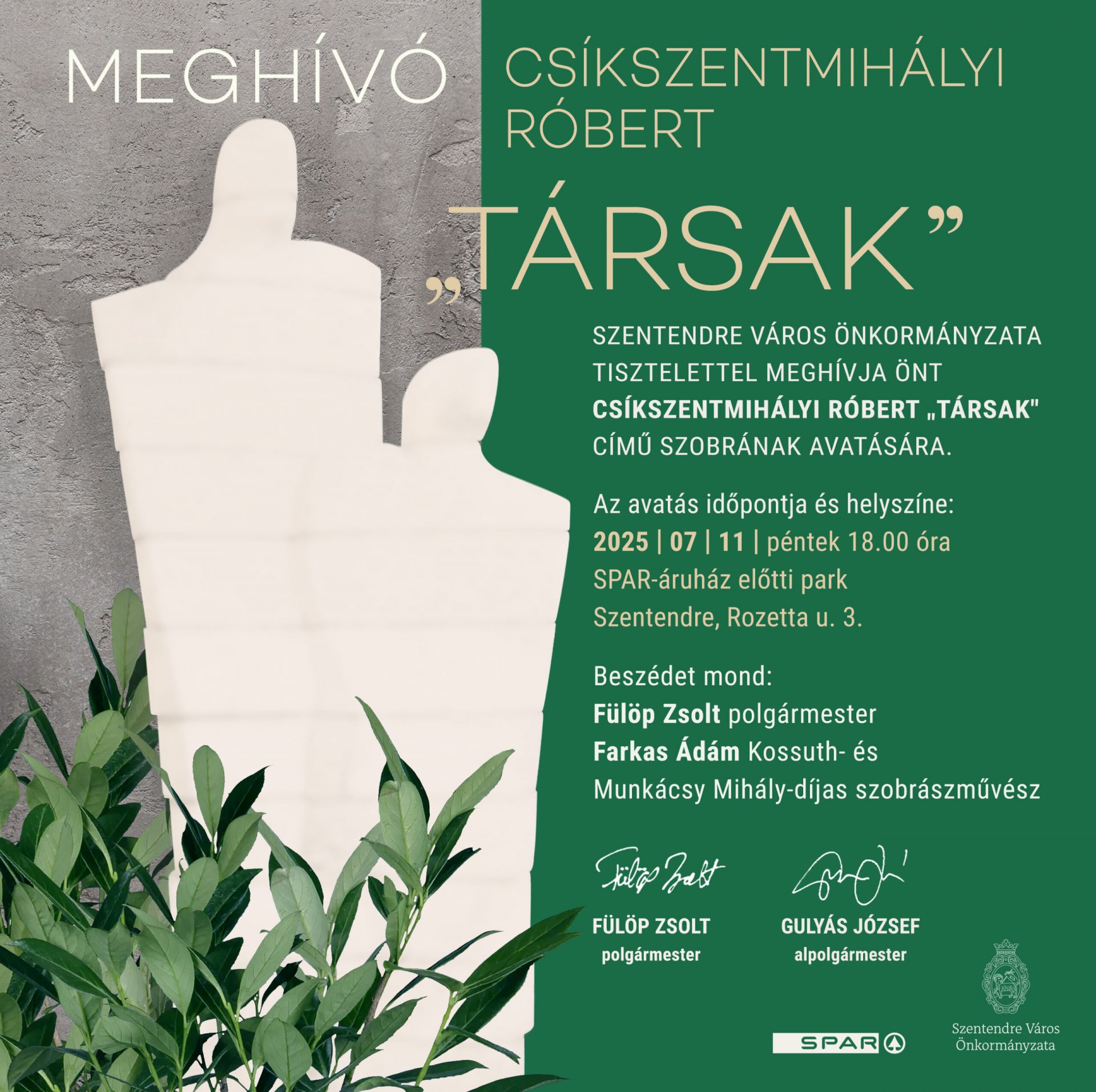 Szentendre Város önkormányzata felavatja Csíkszentmihályi Róbert Társak című szobrát július 11-én pénteken a HÉV-állomásnál lévő új parkban.
