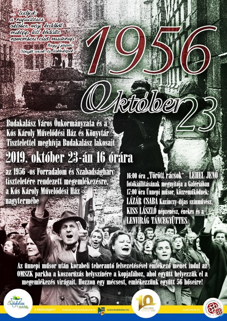 Polgármesterünk és az új képviselő-testület tagjai szabadságunk ünnepének évfordulóján, 2019. október 23-án, 15.00 órakor, a Faluház dísztermében, a testület alakuló ülésén tesznek esküt. Az ünnepi alkalomra szeretettel várjuk Budakalász lakóit, hogy azután az emlékező menettel közösen induljunk el az Omszk-parki kopjafához, ahol az ötvenhatos hősök tiszteletére elhelyezzük a megemlékezés virágait.