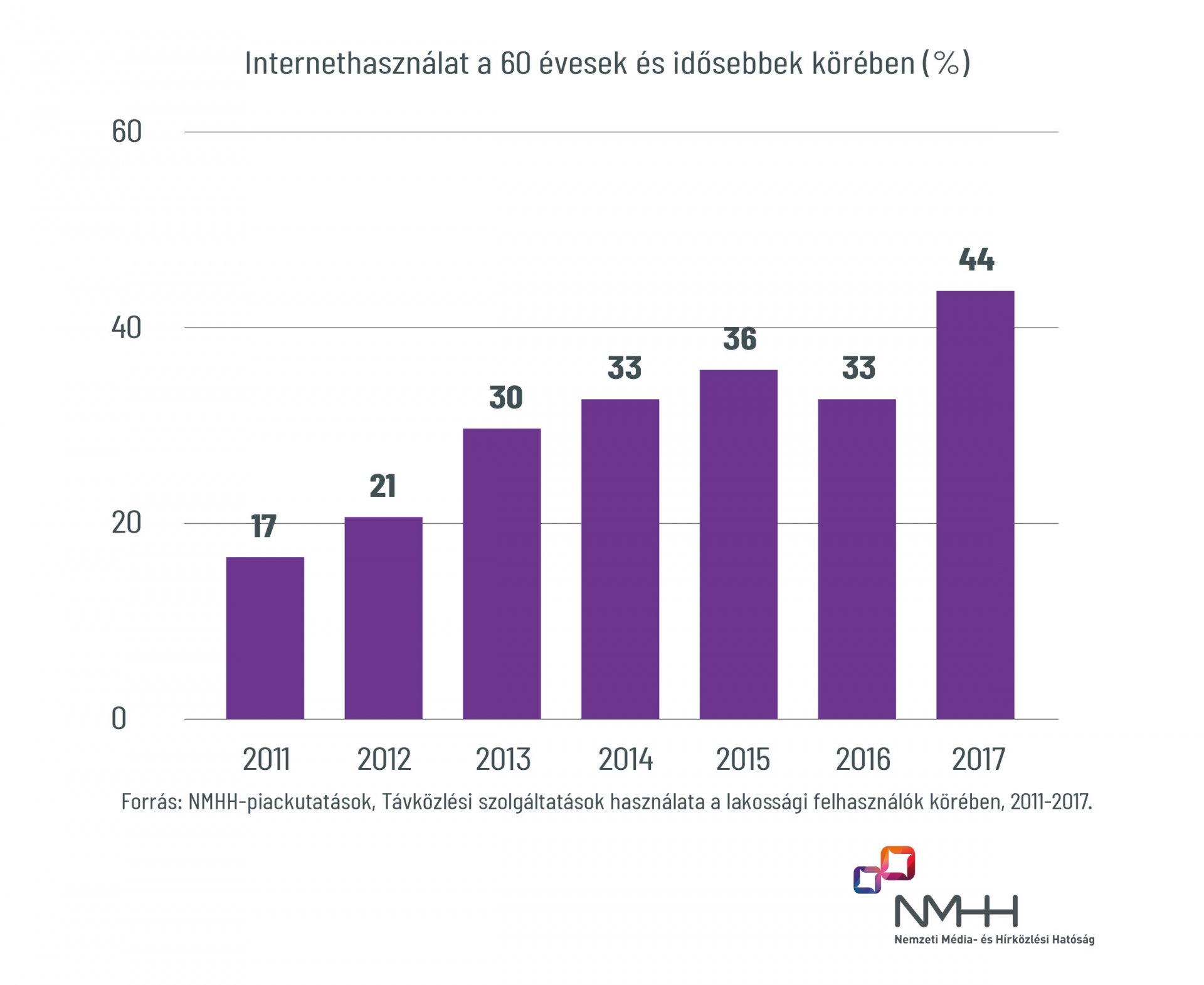 A hatvan éven túliak fele hónapokon belül netezni fog, ha folytatódik a mostani trend – derül ki egyebek mellett a Nemzeti Média- és Hírközlési Hatóság (NMHH) távközlési szolgáltatások használatát lakossági körben vizsgáló legutóbbi éves felméréséből. 2016-ról 2017-re hirtelen 33-ról 44 százalékra nőtt azon idősek aránya, akiknél valamilyen formában a mindennapok részévé vált az internethasználat. A távol élő családtagokkal való olcsó és közvetlen kapcsolattartás lehetősége fontos ösztönző, de az internetezésre alkalmas készülékek is könnyebben kezelhetőek.
