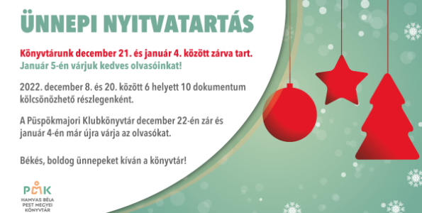 A Püspökmajori Klubkönyvtár december 22-én zár és január 4-én újra várja az olvasókat.