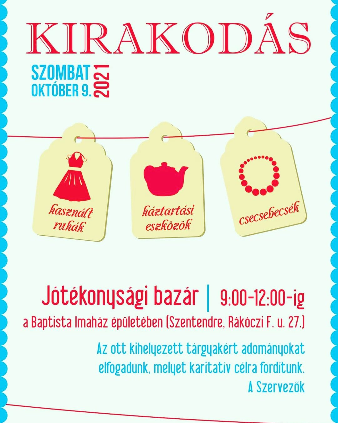 Jótékonysági vásárt rendez a Szentendrei Baptista Gyülekezet október 9-én szombaton, 9-12 óráig a baptista imaház épületében. A kirakodáson található tárgyakért adományokat elfogadnak, melyet karitatív célra fordítanak majd.