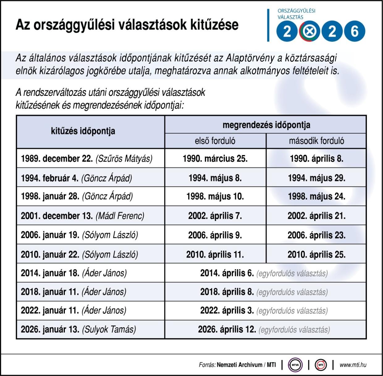 Sulyok Tamás köztársasági elnök a kedden aláírt határozatával kitűzte az országgyűlési képviselők 2026. évi általános választását – közölték az MTI-hez eljuttatott közleményben.