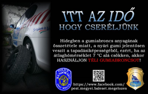 Ugyan még számíthatunk 10 Celsius fok feletti hőmérsékletre, azonban már egyre gyakrabban lehűlhet a hőmérséklet 7 Celsius fok alá. Ezért kérünk mindenkit, hogy a gépkocsiján lévő nyári gumiabroncsait cseréltesse le jó minőségű, 3 évnél nem öregebb téli gumiabroncsokra.