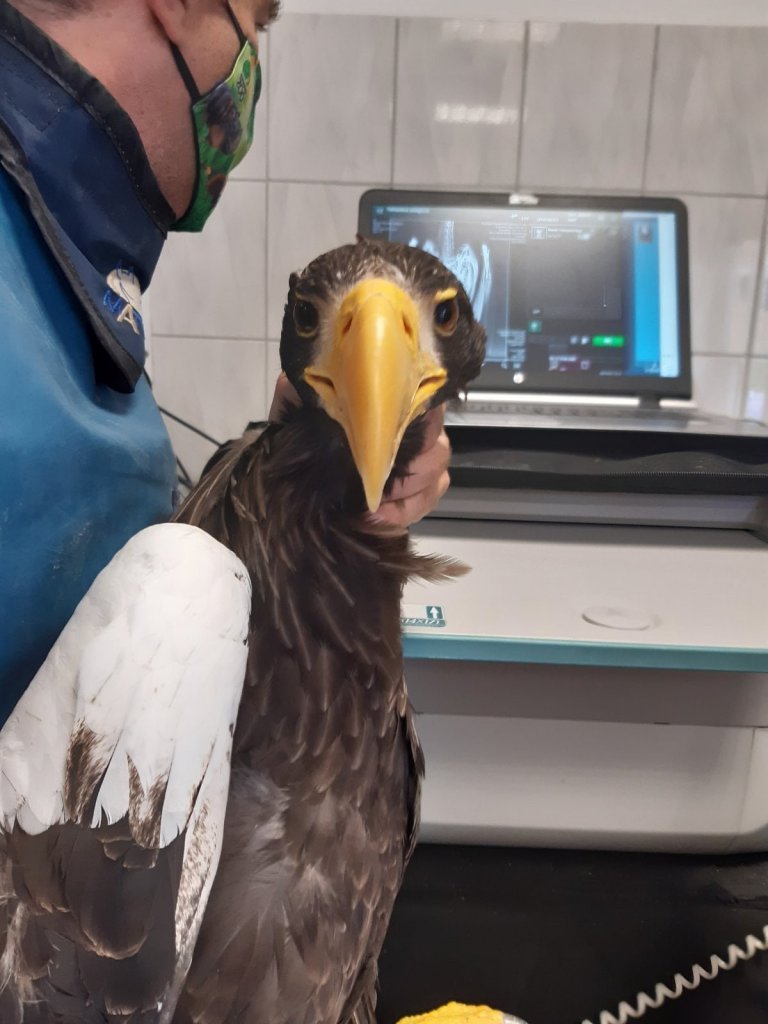 A Kelet-Ázsiában és Alaszkában honos madarat a bőre alatti chip révén tudták azonosítani: mint kiderült, a sas egy németországi solymász bemutatóból (Falknerei Bergisch Land) oldott kereket, és nem egészen két hét alatt jutott el Magyarországra. Bekerülése óta az Állatkert mentőközpontjában erősítették fel az állatot, amely kissé legyengült és le is fogyott az út alatt, alighanem azért, mert út közben kevés olyan táplálékot találhatott, amelyet korábbi lakhelyén megszokott. Az Állatkertben viszont szépen evett, és csakhamar vissza is nyerte erejét.