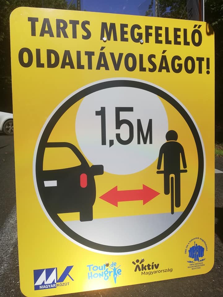Tarts 1,5 méter védőtávolságot! Budakalászhoz közel indult el az a kampány, amit a kerékpárosok biztonsága iránt elkötelezett szervezetek közös szerveznek Magyarország egész területére. Ma délelőtt az első tábla kihelyezésén és a hozzá kapcsolódó sajtótájékoztatón a Kétbükkfa-nyereg elágazásnál részt vett Révész Máriusz, Aktív Magyarországért felelős kormánybiztos, Óberling József rendőr ezredes, az ORFK Közlekedésrendészeti Főosztály vezetője, Mikesz Csaba, a Magyar Közút Nonprofit Zrt. műszaki vezérigazgató-helyettese, valamint Eisenkrammer Károly, a Tour de Hongrie főszervezője.