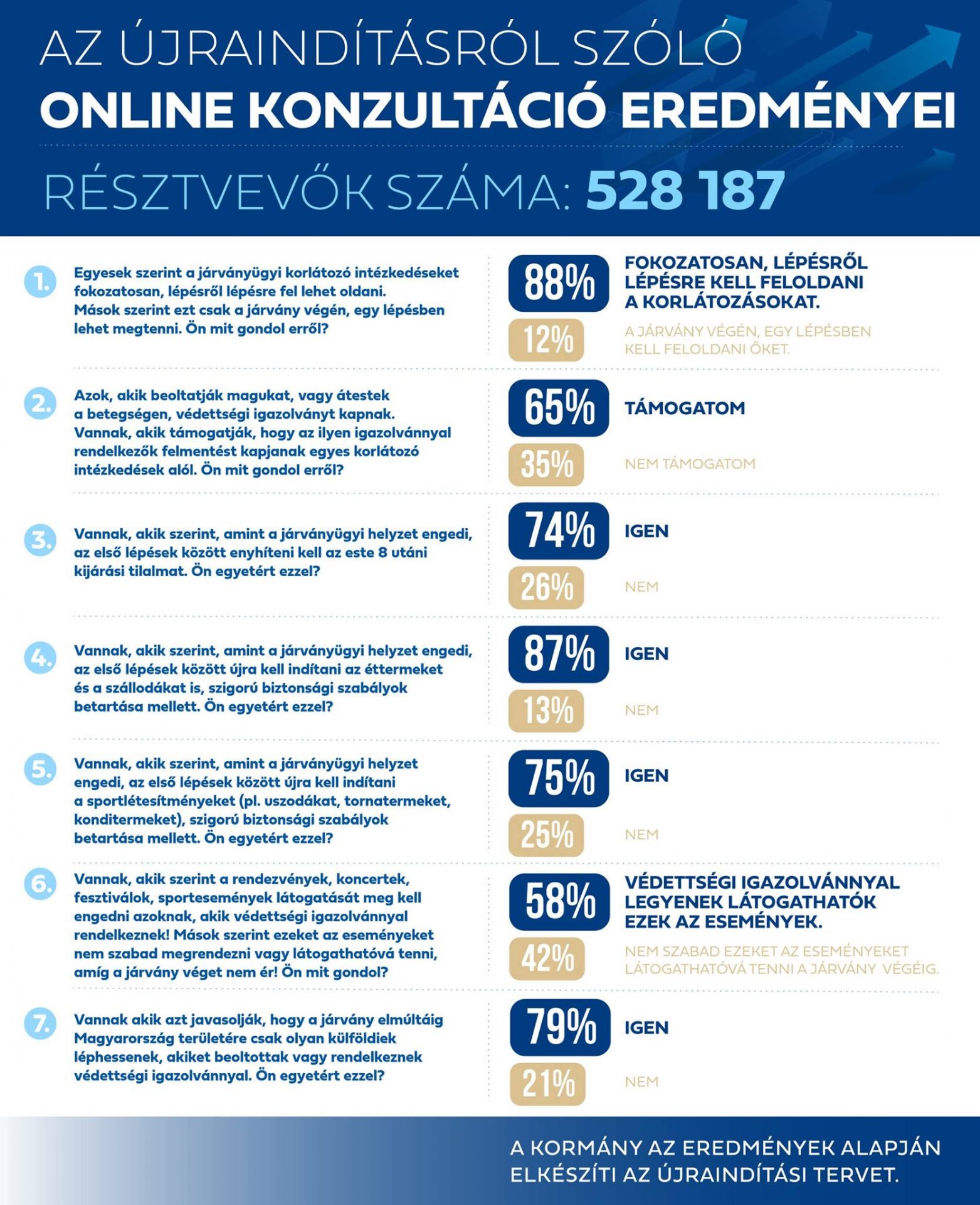 Közzétette a kormány az újraindításról szóló online konzultáció eredményeit: a több mint félmillió válaszadó 88 százaléka egyetértett abban, hogy a járványügyi korlátozásokat fokozatosan, lépésről lépésre kell feloldani - írta a Fidesz frakcióvezetője szombaton a Facebook-oldalán.