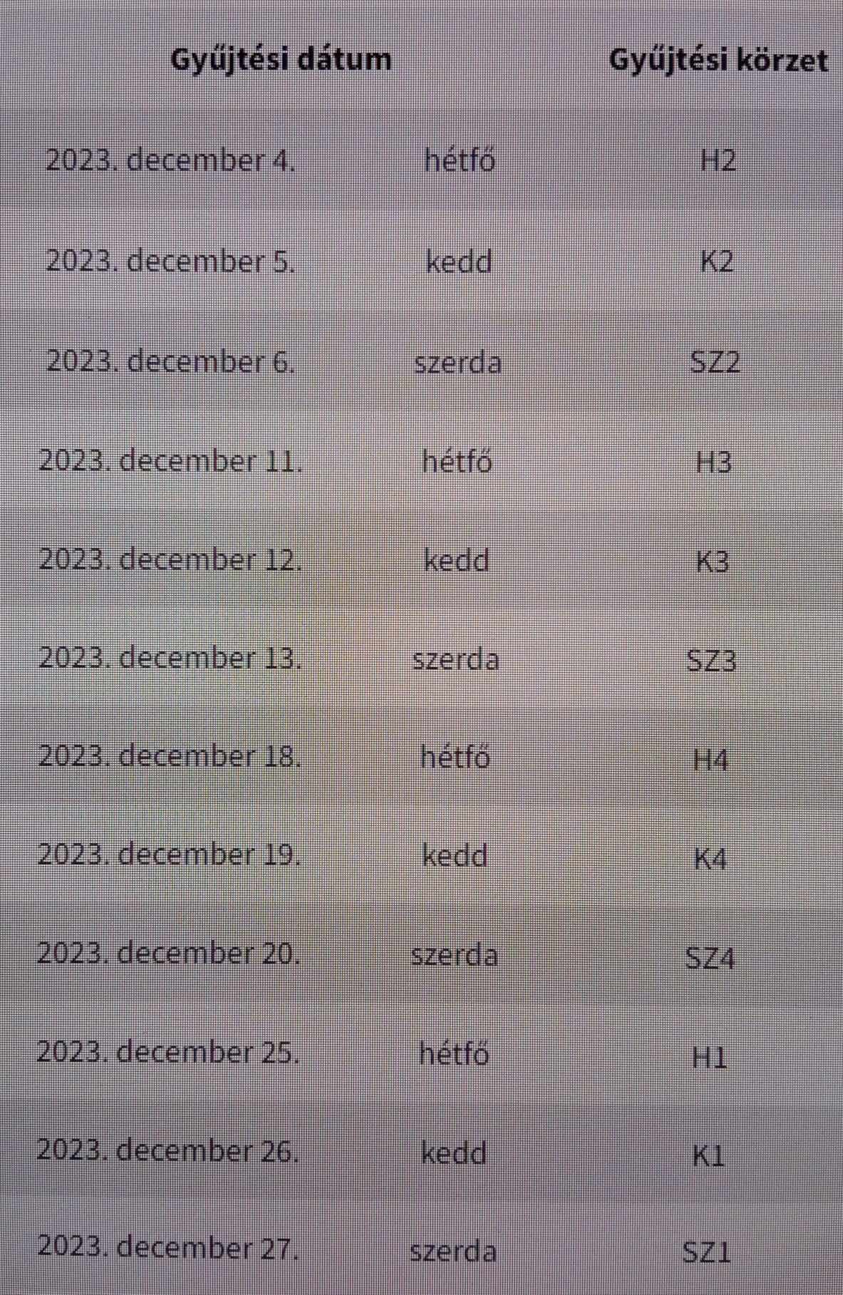 A zöldhulladék-elszállítás a mellékelt táblázat szerinti ütemezésben zajlik, december 4. és 27. között.