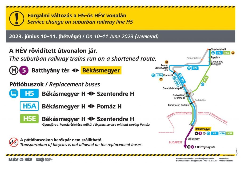 Karbantartás miatt szombaton és vasárnap a H5-ös HÉV rövidített útvonalon, csak a Batthyány tér és Békásmegyer között jár - tájékoztatja közleményében utasait a BKK. A kimaradó szakaszon a H5-ös, a H5A és a H5E pótlóbuszokkal lehet utazni.