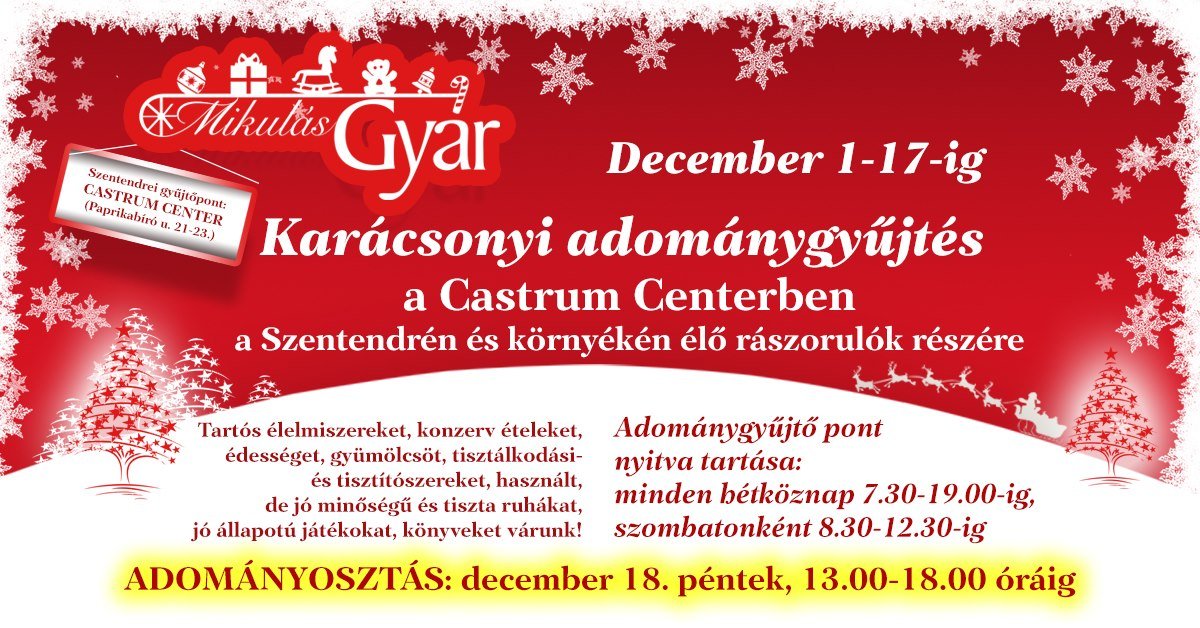 Az adományosztás 2020. december 18-án, pénteken 13 órától 18 óráig a Castrum Center alagsorában lesz. Az adományokat a Magyar Vöröskereszt juttatja el a Szentendrén és környékén mélyszegénységben élő nagycsaládokhoz, rászorulókhoz.
