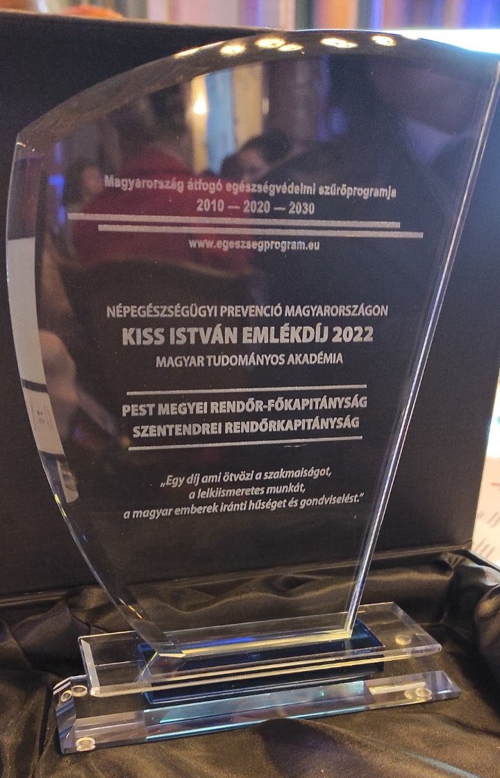 A Szentendrei Rendőrkapitányság programban végzett munkáját elismerő oklevéllel és plakettel ismerték el, amelyet dr. Turi- Kovács Áron Péter r. alezredes, megbízott kapitányságvezető, valamint a programban kiemelkedő teljesítményt nyújtó Kovácsné Németh Viktória r. főtörzszászlós és Bákai Brigitta r. zászlós vehetett át-adta hírül a kapitányság.
