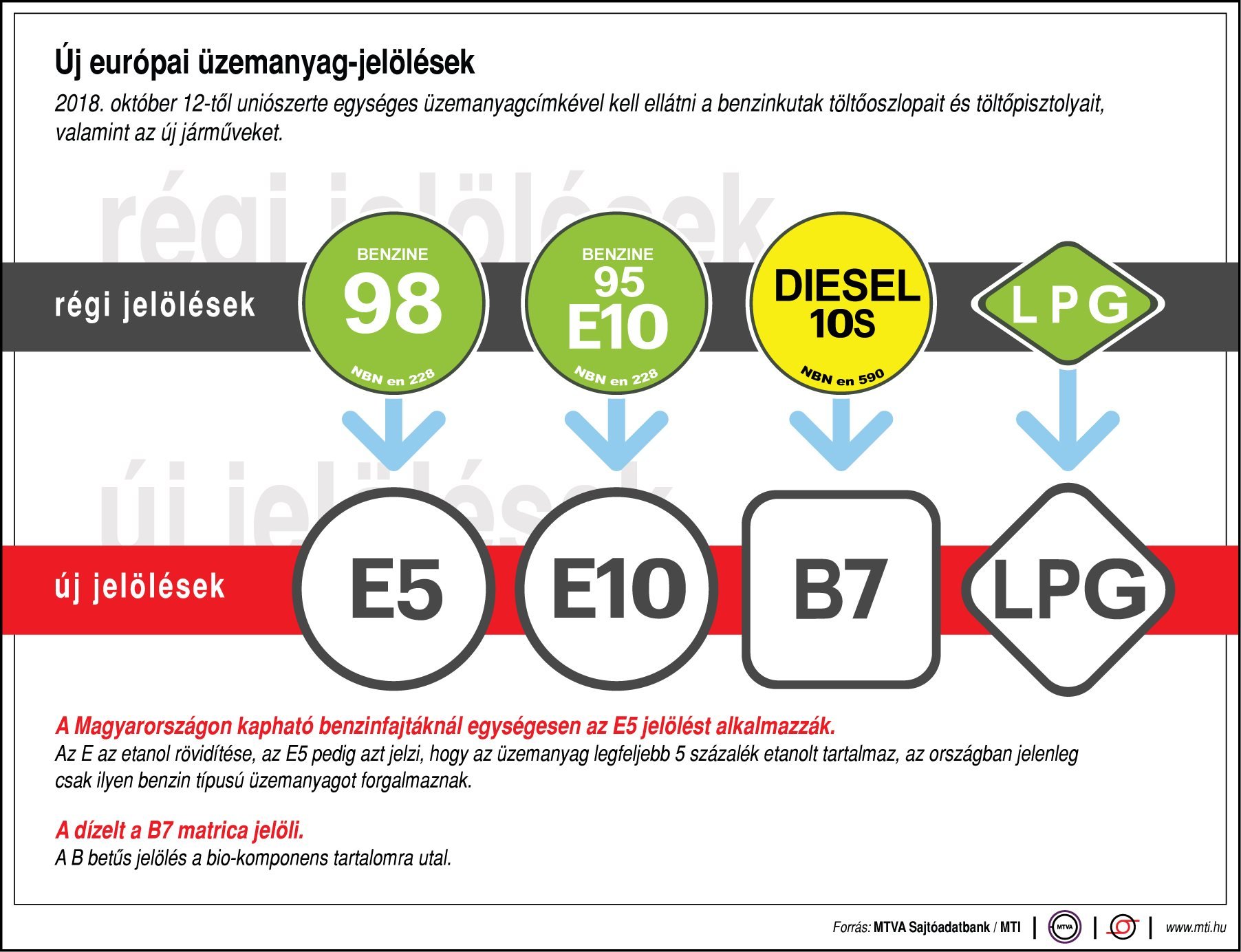 A Magyarországon kapható benzinfajtáknál egységesen az E5 jelölést alkalmazzák. Az E az etanol rövidítése, az E5 pedig azt jelzi, hogy az üzemanyag legfeljebb 5 százalék etanolt tartalmaz, az országban jelenleg csak ilyen benzintípusú üzemanyagot forgalmaznak. A dízelt a B7 matrica jelöli. A B betűs jelölés a bio-komponens tartalomra utal.