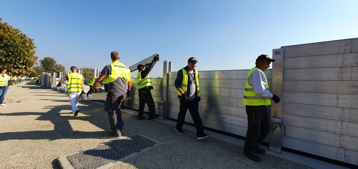 Új rekordidőt állítottak fel a mobil árvízvédelmi gát építésére hívott szakemberek! 75 perc alatt építették fel a mobil árvízvédelmi gátgerendákat.
