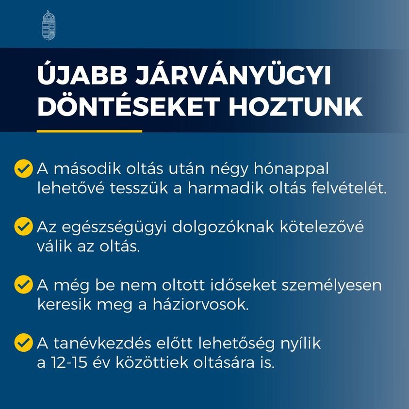 A kormányfő azt mondta, a harmadik oltás felvételére a másodikat követően négy hónap elteltével lesz lehetőség, de az orvosok ettől eltérhetnek. Azt is az orvosok döntik el, hogy melyik oltóanyagot adják be - tette hozzá. Orbán Viktor azt is bejelentette: az iskolakezdés előtt két nappal minden oktatási intézményben lehetővé teszik, hogy a 12 évesnél idősebb gyerekek felvegyék a koronavírus elleni oltást, ha a szüleik ezt megengedik.