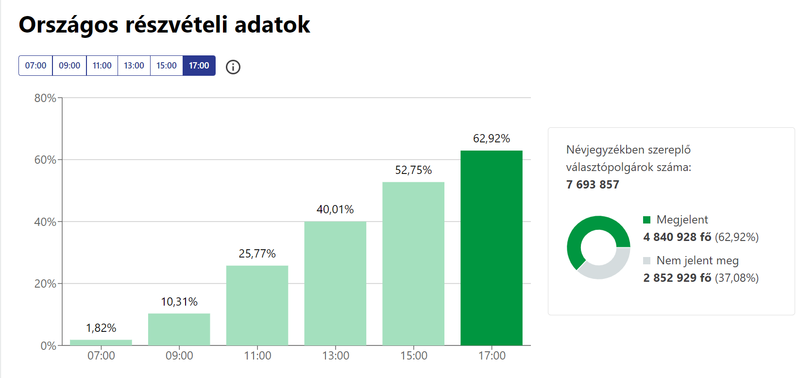A választásra jogosultak 62,92 százaléka, 4 840 928 szavazó járult az urnákhoz a vasárnapi országgyűlési képviselő-választáson 17 óráig a Nemzeti Választási Iroda (NVI) adatai szerint.