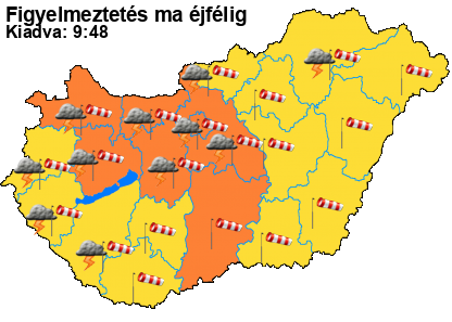A legnagyobb széllökések Győr-Moson-Sopron, Komárom-Esztergom, Veszprém, Fejér, Pest és Bács-Kiskun megyékben, valamint Budapesten várhatók. Az Országos Meteorológiai Szolgálat ezekre a területekre másodfokú figyelmeztetést adott ki a várható viharos széllökések miatt. Az ország többi részén elsőfokú a figyelmeztetés.