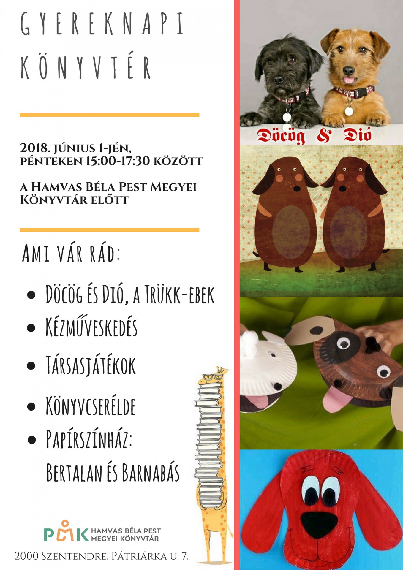 Gyereknapi könyvtér címmel rendez színes programot a Hamvas Béla Pest Megyei Könyvtár 2018. június 1-jén kézműveskedéssel, könyvcserével, papírszínházzal és négylábú mutatványosokkal.