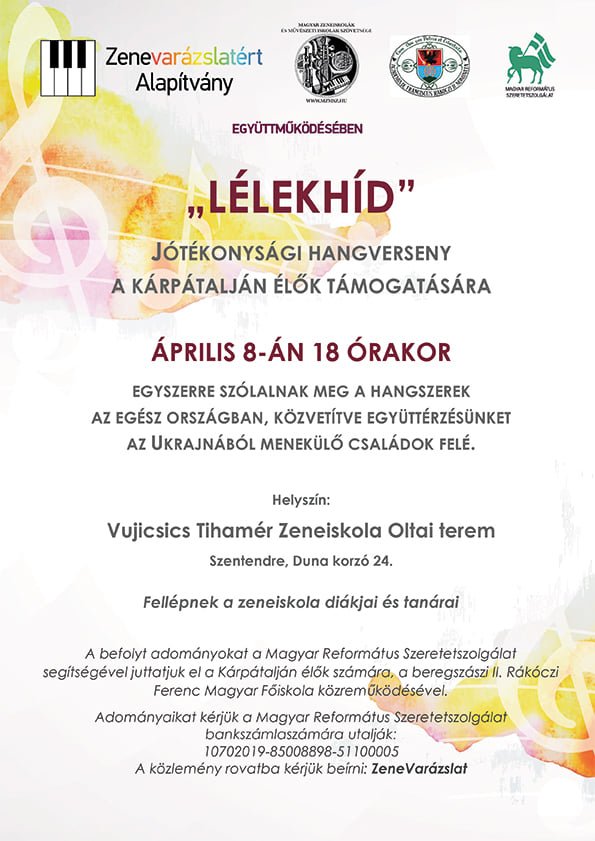 A Vujicsics Tihamér Zeneiskola is csatlakozik a „Lélekhíd" jótékonysági mozgalomhoz, amellyel a Kárpátalján élőket támogatják. Hangversenyt szerveznek április 8-án, pénteken 18.00 órakor, hogy így fejezzék ki együttérzésüket az Ukrajnából menekülők felé és pénzt gyűjtsenek megsegítésükre. A koncerten fellépnek a Vujicsics Tihamér Zeneiskola diákjai és tanárai. A koncert nyilvános, de az ülőhelyek száma korlátozott, ezért részvételi szándékukat a titkarsag@vujicsics.net címen jelezhetik. A támogatás összege nem meghatározott. A helyszínen befolyt adományokat a Magyar Református Szeretetszolgálat segítségével juttatják el a Kárpátalján élők számára. Aki a koncerten személyesen nem tud részt venni, anyagi támogatást küldhet a Magyar Református Szeretetszolgálat bankszámlaszámára: 10702019-85008898-51100005. A közlemény rovatba kérik, írják be: ZeneVarázslat