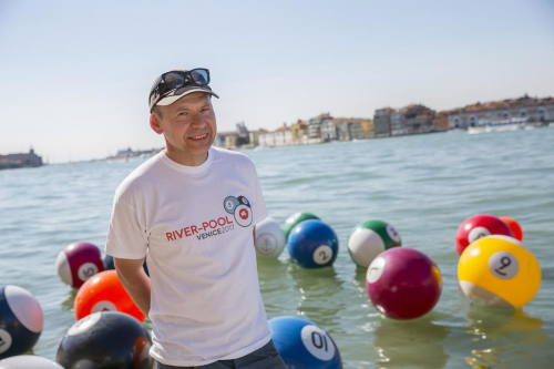 Vincze Ottó installációja tizenhét darab, méretes biliárdgolyókká alakított hajózási ütközőbója, amit már el is helyeztek a Canale della Giudecca vizén. A művész az olasz nagyvárosban rendezett képzőművészeti biennáléra készítette a River-pool című alkotását. A szentendrei installációra horgonyos, kettős kereszt mintákat festett, a velenceire oroszlánt rajzolt. A szimbólum a vízi úton folytatott kereskedelemre és az abból felvirágzó kulturális örökségre utal.