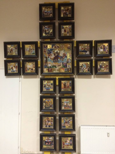 Tábori Csaba Jézus életének 21 epizódját megfestve készített kereszt alakú térinstallációt. Ezt és a képekhez készített vázlatokat a szecessziós palota aulájában állítják ki.Az egyik első emeleti kiállítótérben kapnak helyet ef Zámbó Istvánnak a keresztény ikonográfiai hagyományokat újraértelmező festményei.Ezen a szinten láthatók Aknay János képei is. A Kossuth-díjas festő- és szobrászművész alkotásain már a hetvenes évektől megjelennek a szárnyas angyalfigurák, melyek feltűnnek a gyűjtemény számára készített képeken is.A Regionális Összművészeti Központban a március 10-ig látható kiállításhoz kapcsolódva előadásokat tartanak a keresztény művészetről és a Bibliáról. A tárlat alkalmából – a kiállítássorozat más helyszíneihez hasonlóan – rajzpályázatot hirdettek általános iskolások számára. A legjobb műveket majd Budapesten mutatják be a három alkotó képeivel együtt.