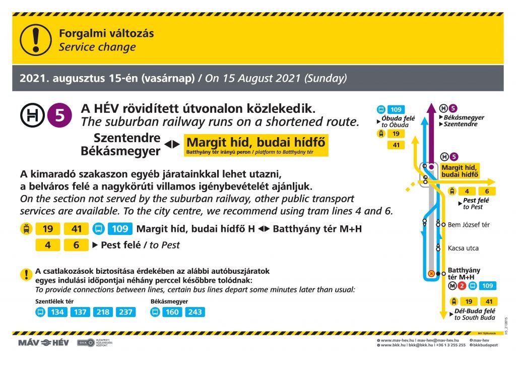 A H5-ös HÉV a Batthyány tér helyett csak a Margit hídig közlekedik és onnan is indul Békásmegyer és Szentendre felé karbantartás miatt augusztus 15-én, vasárnap.