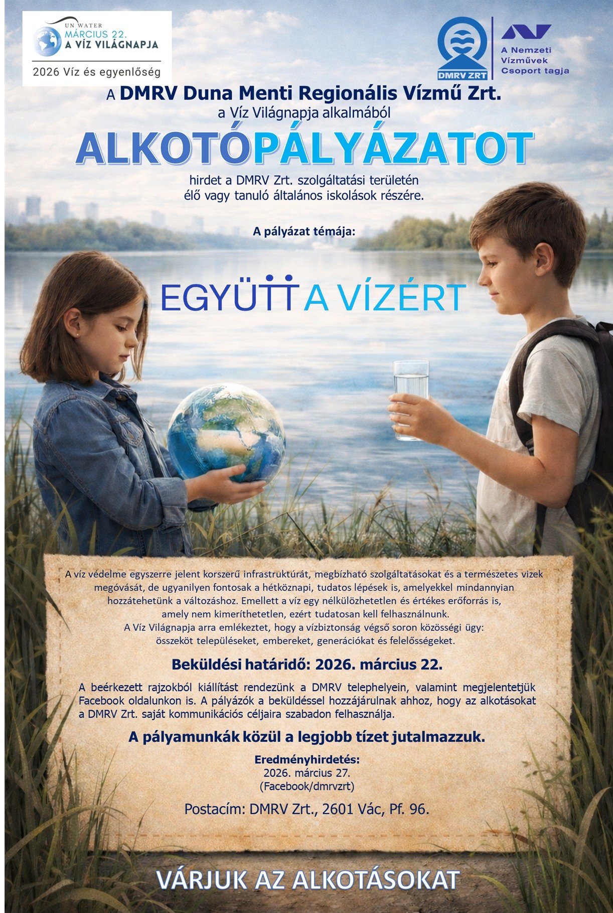 A DMRV Duna Menti Regionális Vízmű Zrt. a Víz Világnapja alkalmából alkotópályázatot hirdet általános iskolás diákok számára, akik a cég szolgáltatási területén élnek vagy tanulnak. - olvasható a DMRV facebook oldalán.