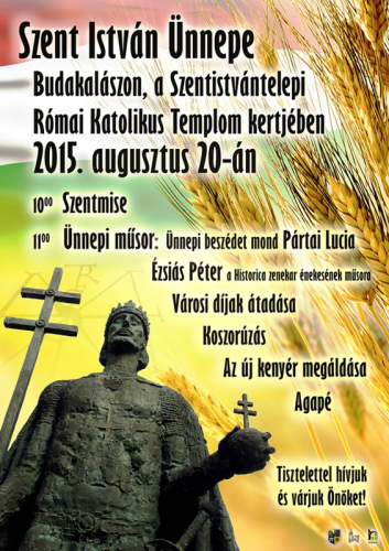 Ezúton meghívjuk a lakosságot a Szent István Király és a Magyar Államalapítás tiszteletére rendezett ünnepségre, melynek keretében délelőtt 10 órai kezdettel lesz a szentmise, majd 11 órakor az ünnepi műsor, ahol az ünnepi beszédet Pártai Lucia mondja, majd Ézsiás Péter a Historica zenekar énekesének műsora. A városi díjak átadására is itt kerül sor, aztán a hagyományos koszorúzás, kenyéráldás következik. Az ünnepség Budakalászon a Szentistvántelepi Római Katolikus Plébánia kertjében lesz.