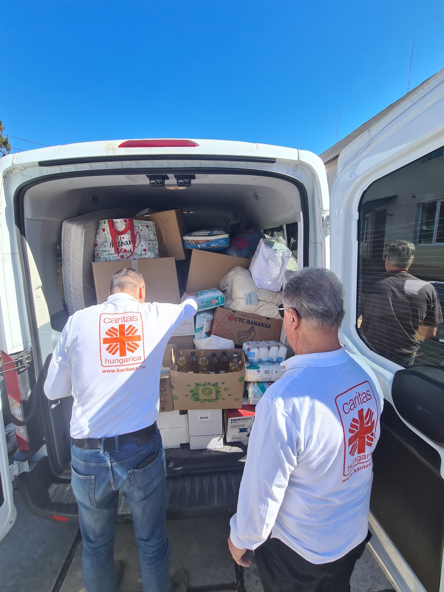 Ezután a nagyszőllősi Karitász központban és Técsőn adtuk át az adományokat. Nagybocskón, Rahón, a helyi Karitász csoport üzemeltette Magyar Házban berendezett menekültszállásra vittünk élelmiszert és tisztálkodási szereket, ruhákat, pelenkákat, majd a városi kórházban mértük fel a kórház igényeit. Kőrösmezőn a helyi iskolában berendezett menekültszállón és ingyenkonyhán élelmiszereket, tisztálkodási szereket, konyhafelszereléseket adtunk át, majd a plébániára befogadott menekülteket látogattuk meg és láttuk el őket tartós élelmiszerrel és tisztálkodási szerekkel. Hazafelé az aknaszlatinai Bolyai Líceumban, a magyar kormány által építtetett és jelenleg menekültszállásként működő tornacsarnokban élelmiszert, takarókat, ruhákat és tisztálkodási szereket adtunk át. Az utolsó napon a viski Karitásznak illetve a polgármesternek adtunk át élelmiszereket, pelenkákat és tisztálkodási szereket.