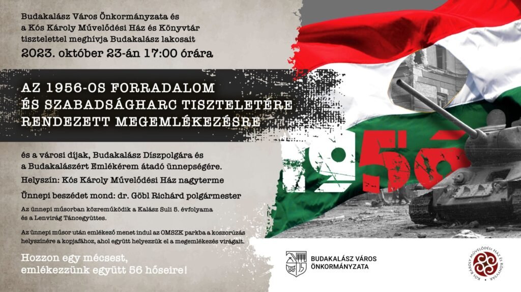 Az 1956-os forradalom és szabadságharc tiszteletére ünnepséget szervez Budakalász Város Önkormányzata és a Kós Károly Művelődési Ház és Könyvtár munkatársai – tájékoztatnak Budakalász Város hivatalos honlapján. Az ünnepség október 23-án, hétfőn 17 órakor kezdődik a Kós Károly Művelődési Ház és Könyvtár nagytermében. Az ünnepi műsorban közreműködik a Kalász Suli ötödik évfolyama és a Lenvirág Táncegyüttes, beszédet mond dr. Göbl Richárd, polgármester. A városi díjakat a megemlékezésen adják át, az ünnepséget követően fáklyás felvonulás indul a Faluháztól az Omszk parkba, ahol a kopjafánál elhelyezik a virágokat. Az önkormányzat kéri, hogy a résztvevők vigyenek egy mécsest, így emlékezve ’56 hőseire.