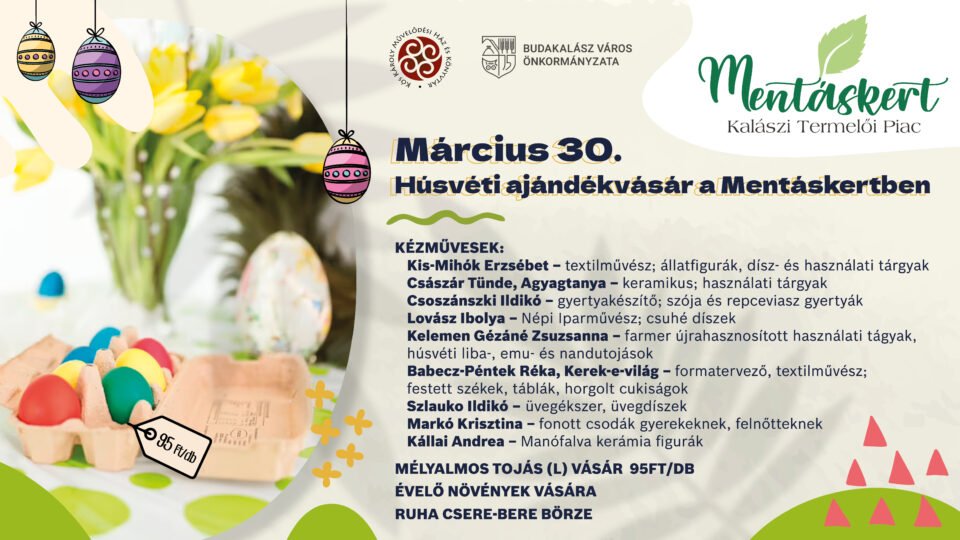 Március 30-án, csütörtökön 14 és 18 óra között húsvéti ajándékvásár és ruha csere-bere lesz Mentáskertben. Az ünnepre hangolódva, a finom élelmiszerek vásárához kapcsolódóan jelen lesznek Húsvétra kínált portékáikkal keramikus, gyertyakészítő, népi iparművész, formatervező, textilművész és üvegfújó kézművesek: