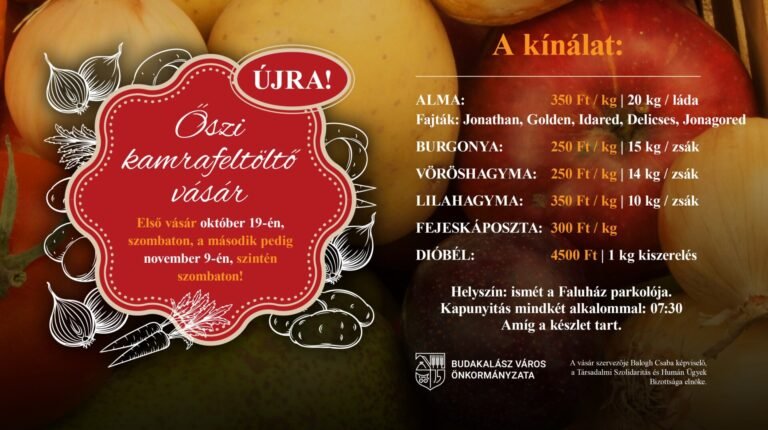 Időpont: október 19. és november 9., kapunyitás 7:30, a vásár pedig a készlet erejéig tart, ezért érdemes korán érkezni. Helyszín a Faluház udvara.