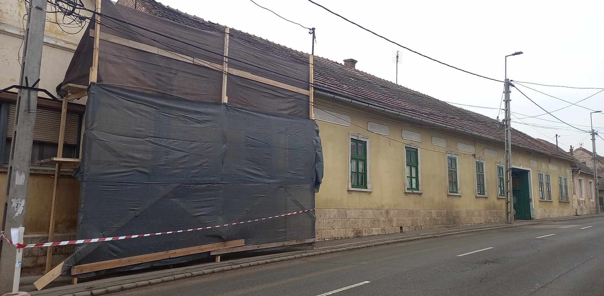 A balesetveszély elkerülése érdekében a járda felett védőtető készült, így a munkálatok idején a gyalogosok biztonságosan közlekedhetnek. Az oromfalat még az ünnepekig visszabontják, a munkálatok a tervek szerint március 15-ig elkészülnek. A beruházás a balesetveszély elhárítását célozza, a rossz állapotban lévő épület teljes felújítására a város és a nemzetiségi önkormányzat pályázat útján igyekszik forrást szerezni. Az építkezéssel járó esetleges kellemetlenségek miatt az arra közlekedők szíves türelmét előre is köszönjük!